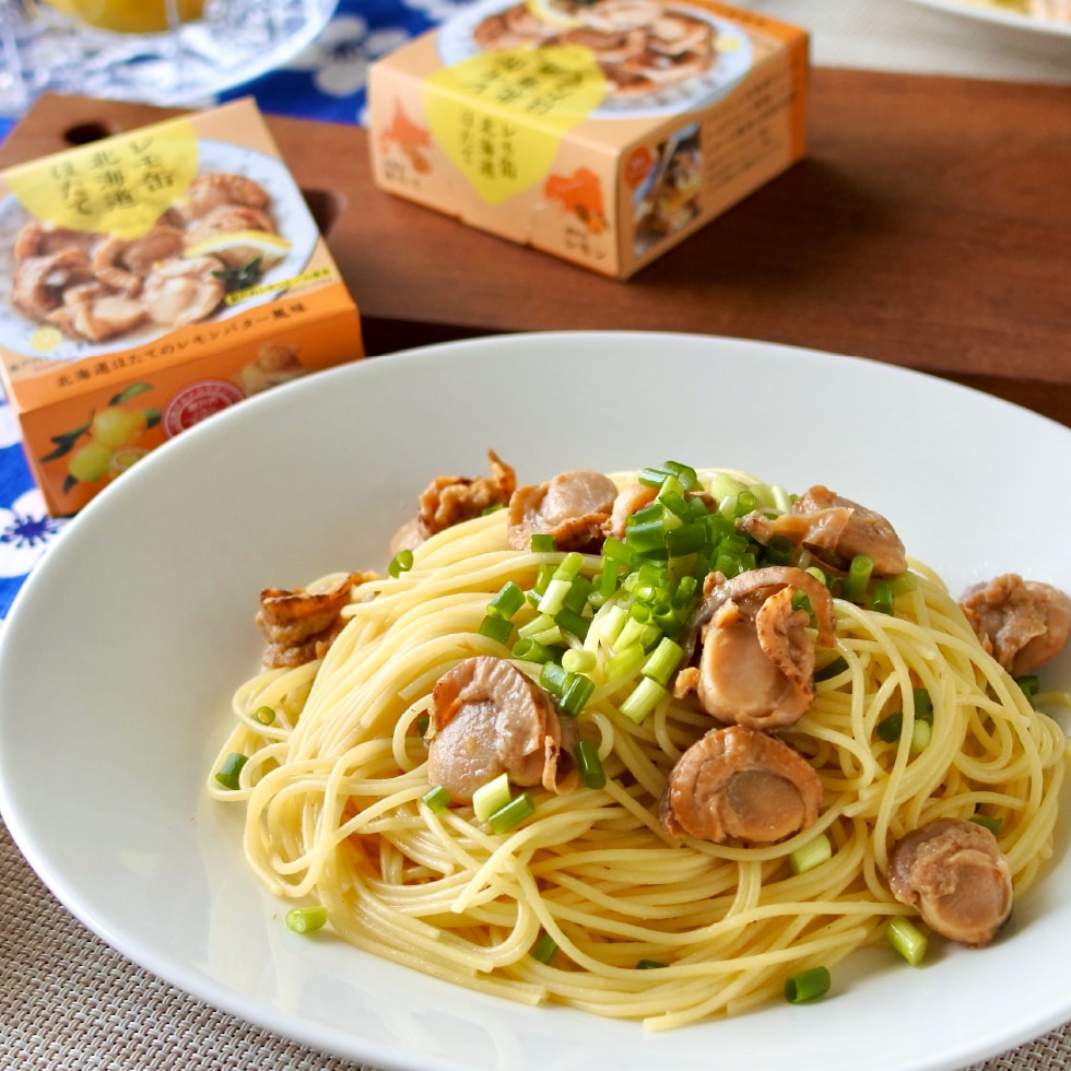 原材料名 ほたて(北海道産)、塩レモン(レモンピール、レモン果汁、食塩)、食用風味油、ホタテエキス、レモン果汁、菜種油、食塩、香辛料、バター/香料、(一部に乳成分・大豆を含む)